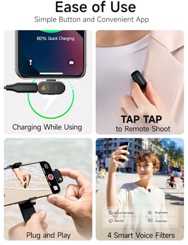 328ft Stable Transmission: The Wave T1 mini mics is Plug-and-play, delivers a uninterrupted 328ft connection without signal dropouts. The LED indicator displays the working status, and with a double-tap, you can effortlessly remote control of photo capture or video recording
