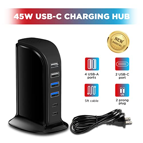 USB C Charger Block Upoy, Chargers for Multiple Devices Dual Type C 45W Total, 6 Ports USB Charging Station for iPhone, Ipad, Iwatch, Desk Accessories & Workspace Organizers