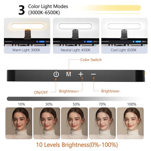 【3 Color Modes and 10 Levels of Brightness】 Our zoom lighting for home office adopts eye protection technology, the light is soft, natural and flicker-free. The in a meeting light for computer video conferencing provides 3 color modes and 10 levels of brightness, you can set the zoom call lighting atmosphere according to the environment. No matter where you are, this ring light for laptop zoom meetings can perfectly present you